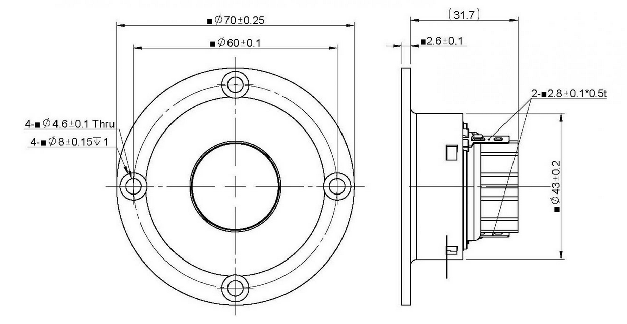 This BC family tweeter features a 4 ohm 25 mm voice coil, a damped fabric dome for smooth frequency response performance, and ferrofluid in the gap of the NdFeB motor, providing enhanced cooling of the voice coil. The tweeter comes with a compact faceplate with recessed mounting holes.A finned heat sink has been added for improved power handling.